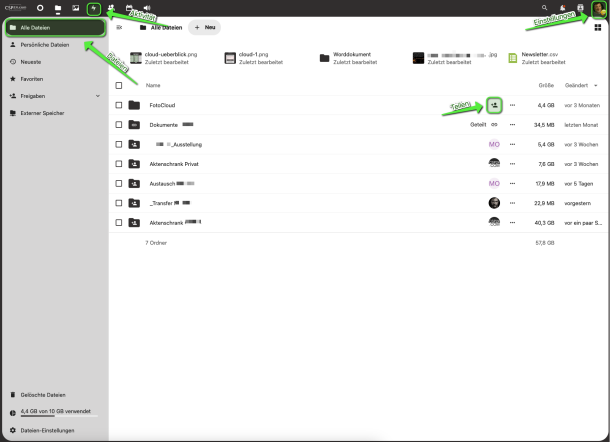 • Teilen: Du kannst Dateien und Ordner mit anderen Nutzern teilen.